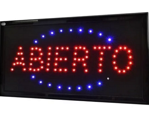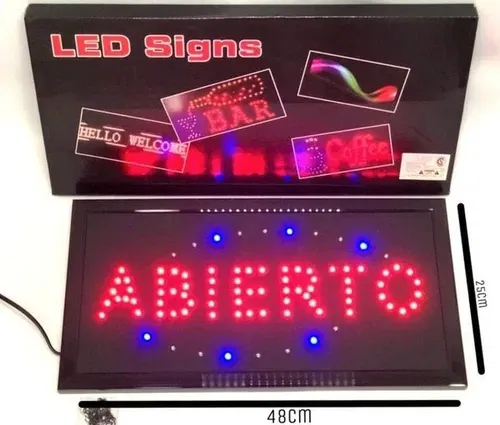 CARTEL LED LUMINOSO – ABIERTO Especificaciones del producto: -Medidas: 50 x 26 x 3 cm. -Se enchufa a 220v -Apto para colgar -Super bajo consumo EXCELENTE VISIBILIDAD TANTO DE DIA COMO DE NOCHE FONDO NEGRO LETRAS ROJAS/AZULES – EXCELENTE CONTRASTE EFECTO IDEAL PARA ATRAER CLIENTES – AUMENTA VISIBILIDAD DE LOCALES ESPECTACULAR CALIDAD Y TERMINACION