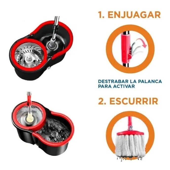 Descubre la comodidad y eficiencia del Trapeador De Piso Giratorio 1 Mopa Lampazo Con Rueditas, diseñado para facilitar la limpieza de tu hogar. Este innovador balde mopa centrifugo cuenta con un tambor y bastón de acero inoxidable, garantizando durabilidad y resistencia. Su plato de plástico y balde de plástico reforzado ultraresistente aseguran un uso prolongado. Incluye 1 paño superabsorbente de microfibra de alta calidad, ideale para atrapar la suciedad y el polvo. Las ruedas facilitan el transporte, mientras que el cabezal giratorio del lampazo de limpieza permite alcanzar rincones difíciles. Con repuestos de mopa universales y un sistema de centrifugado por presión en el palo, este trapeador es la solución perfecta para mantener tus pisos impecables. ¡Haz de la limpieza una tarea sencilla y rápida!