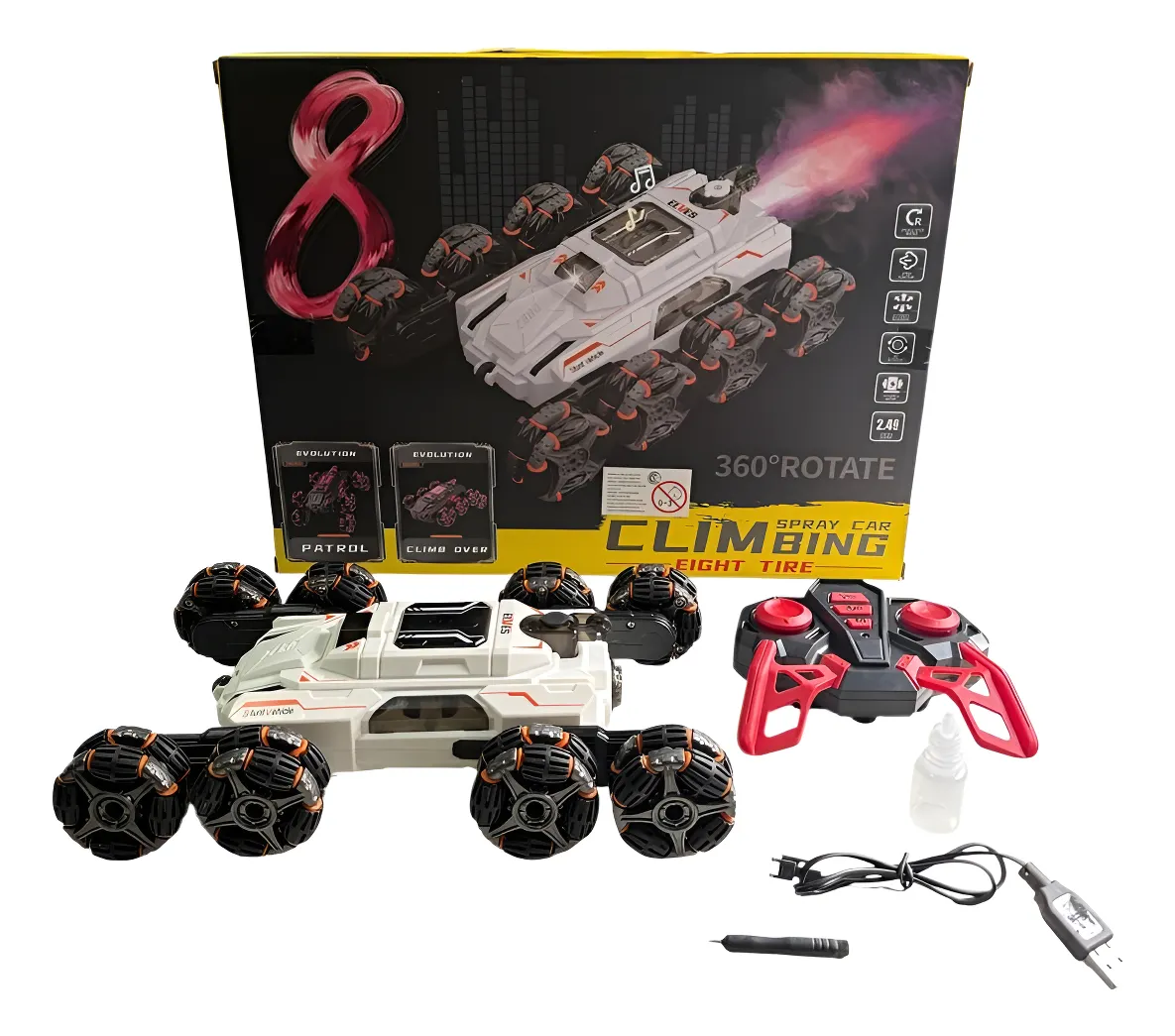 - auto con 8 ruedas - control remoto - pila recargable con cable cargador USB para el auto (no incluye pilas para el control remoto: 2 pilas AA) - tarro para cargar agua para poner dentro del vehículo para simular salida de gas nitrógeno por el caño de escape - destornillador - este modelo NO incluye el reloj control DESCRIPCION Descubre la emoción de la aventura con el Auto a Control Remoto Todo Terreno 360 Trepa Gira Rotación de Bs As Technology. Diseñado para desafiar cualquier superficie, este vehículo radiocontrol permite una maniobrabilidad excepcional, permitiendo que los más pequeños, así como los adultos, disfruten de una experiencia única de juego al aire libre o en interiores. Con una estructura robusta y resistente, el modelo RKC01 está perfectamente equipado para trepar y girar en diferentes terrenos, convirtiéndolo en el compañero ideal para aventuras llenas de acción. Su tecnología avanzada permite giros rápidos y movimientos de 360 grados, ofreciendo diversión ilimitada. El vehículo se alimenta mediante un sistema USB, facilitando la carga y asegurando que esté siempre listo para la próxima expedición. El control remoto, que opera con dos pilas AA, está diseñado para ser intuitivo, así los usuarios de todas las edades pueden disfrutar de su funcionamiento sin complicaciones. Este auto a control remoto es recomendado para niños a partir de 3 años, haciendo de él una opción perfecta para compartir momentos de diversión en familia. Con un diseño atractivo y funcional, ofrece horas de entretenimiento, garantizando sonrisas y risas en cada aventura.