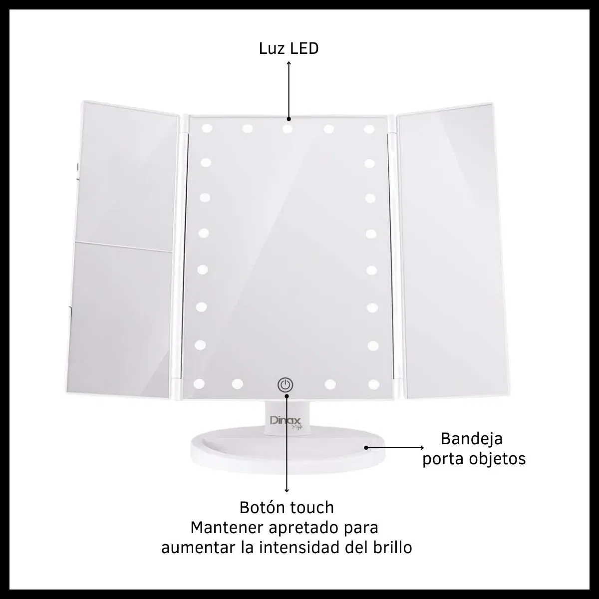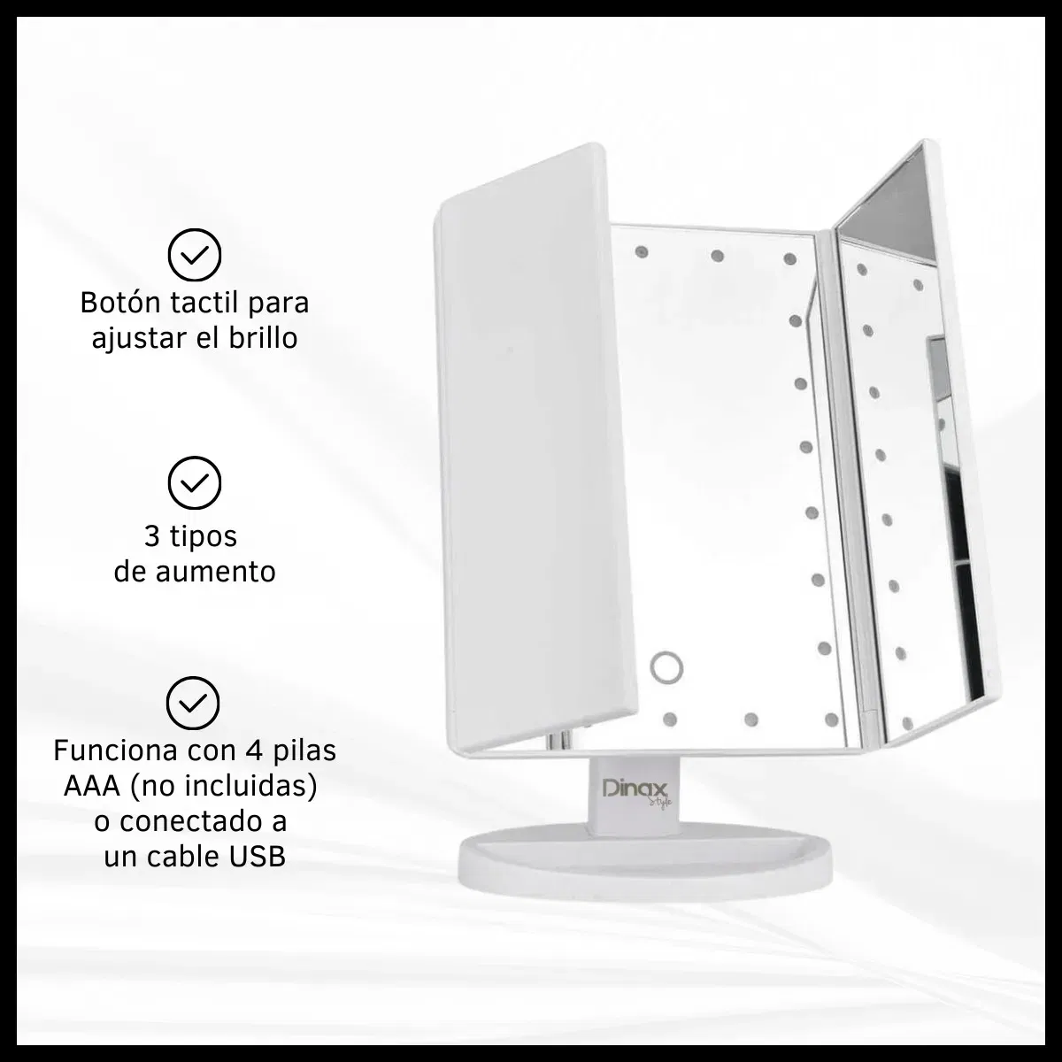 Descubre el Espejo Triple Touch para Maquillaje con Luz LED Fría Táctil, una herramienta esencial para tu rutina de belleza. Este espejo innovador cuenta con una bandeja porta objetos, ideal para mantener tus cosméticos organizados mientras te maquillas. Su diseño rectangular y funcionalidad giratoria de 180º te permite ajustar el ángulo según tus necesidades. Con 22 luces LED frías, disfrutarás de una iluminación óptima que realza tus rasgos. Además, ofrece tres tipos de aumento y tres niveles de brillo, lo que garantiza una experiencia personalizada. Funciona con 4 pilas AAA o mediante un cable USB, brindándote flexibilidad en su uso. Perfecto para el baño, dormitorio, escritorio o mesa, este espejo es la combinación ideal de estilo y funcionalidad. ¡Transforma tu rutina de maquillaje con este espejo de alta calidad!
