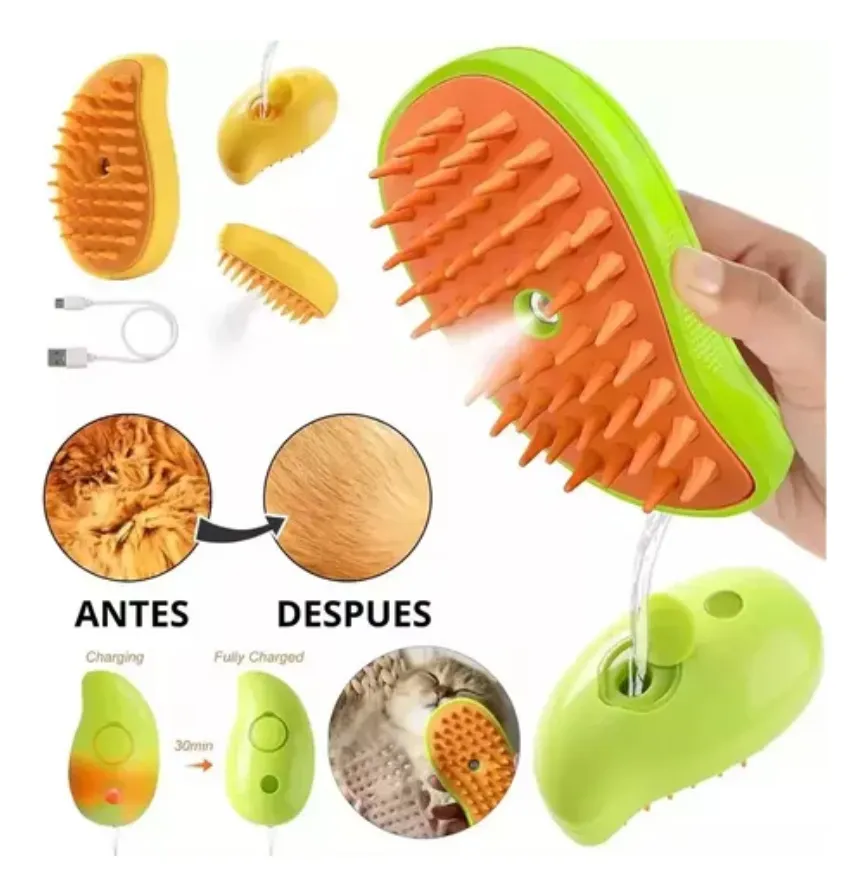 Cepillo con vapor para Perros y Gatos El cepillo rociador para mascotas elimina eficazmente el pelo suelto y los restos, dejando su pelaje limpio, suave y sin enredos. Los dientes de silicona suaves y redondeados no arañan ni irritan la piel. Promueve una mejor circulación sanguínea y permite que su mascota disfrute de una experiencia de aseo cómoda y sin estrés. Nuestro cepillo para gatos y perros presenta un diseño de rociado de vapor, lo que le permite rellenarlo con agua o esencia. Con solo un clic, puede humedecer fácilmente el pelo de su mascota ligeramente, haciendo que la eliminación del pelo sea fácil. Carga fácil mediante puerto de carga USB y cable. Adecuado para todo tipo de mascotas, incluidos perros, gatos e incluso conejos. Nuestro cepillo de pelo para mascotas es ideal para el cuidado regular, reducir la caída, prevenir las bolas de pelo y mantener el abrigo de su amigo peludo saludable y brillante.