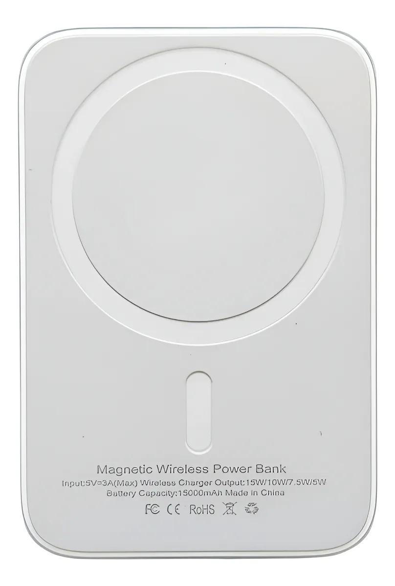 Cargador Portátil Magnético de 15000mAh con Carga Inalámbrica Lleva tu energía siempre contigo gracias a este power bank de 15000mAh que combina carga inalámbrica rápida y diseño magnético para mayor comodidad y versatilidad. Diseñado para usuarios que buscan practicidad y rendimiento, es ideal tanto para uso diario como para viajes o actividades al aire libre. Características principales: Gran capacidad de 15000mAh: Permite cargar tu teléfono u otros dispositivos electrónicos, garantizando que siempre tengas batería disponible. Diseño magnético: Se adhiere fácilmente a la parte trasera de dispositivos compatibles, proporcionando una carga inalámbrica estable y cómoda sin necesidad de cables. Carga inalámbrica rápida: Compatible con dispositivos que admiten tecnología Qi, ofreciendo una experiencia de carga sencilla y eficiente. Compacto y ligero: Su tamaño reducido facilita llevarlo en bolsillos, mochilas o carteras, siendo perfecto para viajes, oficina o cualquier salida. Protección completa: Equipado con sistemas de seguridad para evitar sobrecarga, sobrecalentamiento y cortocircuitos, cuidando tanto tu power bank como tus dispositivos. Conclusión: Este power bank magnético de 15000mAh combina diseño, seguridad y funcionalidad, ofreciendo una solución de carga moderna, cómoda y versátil para acompañarte durante todo el día, manteniendo tus dispositivos siempre listos para usar. El Battery Pack se carga a través de un puerto Lightning. No incluye cable de carga, por lo que necesitarás un cable Lightning a USB-C o Lightning a USB-A (dependiendo del puerto de carga que tenga ).