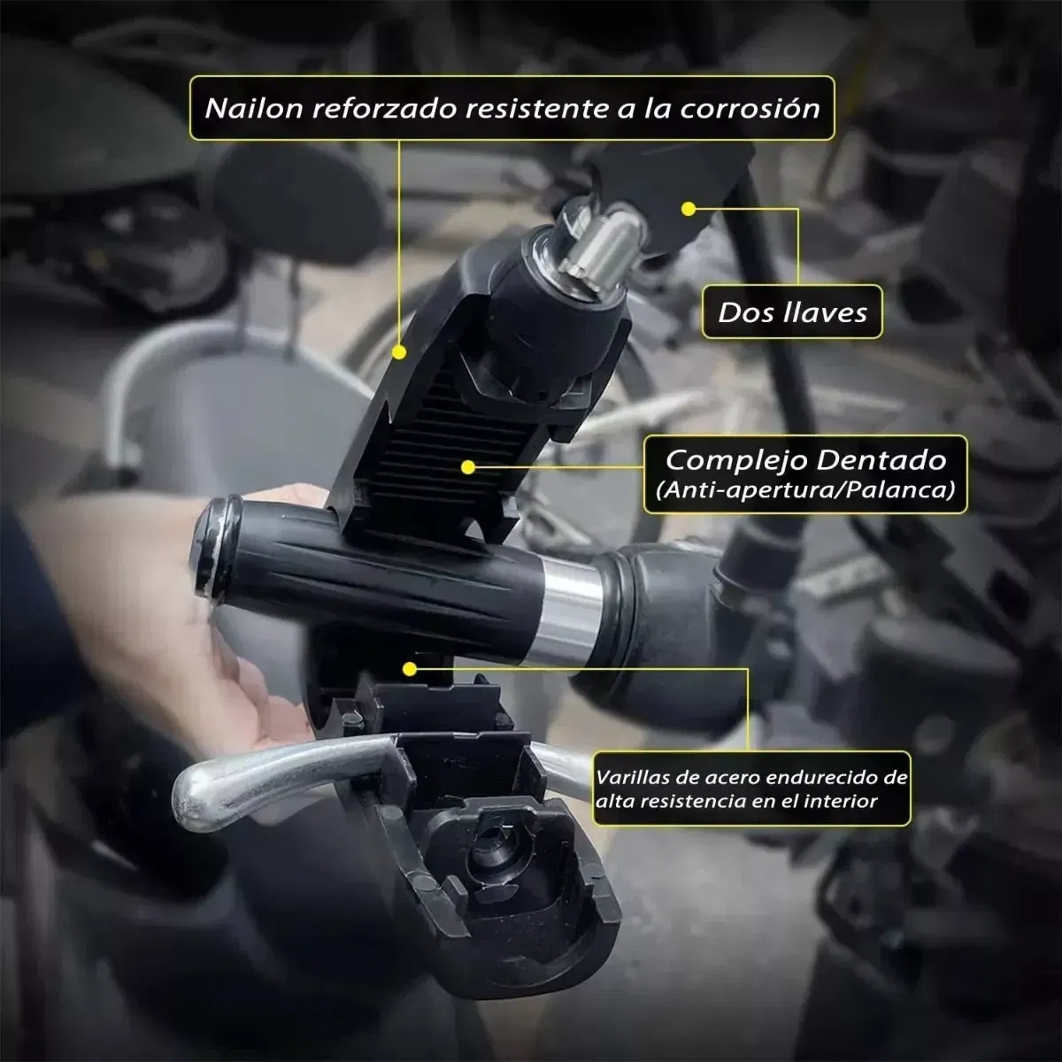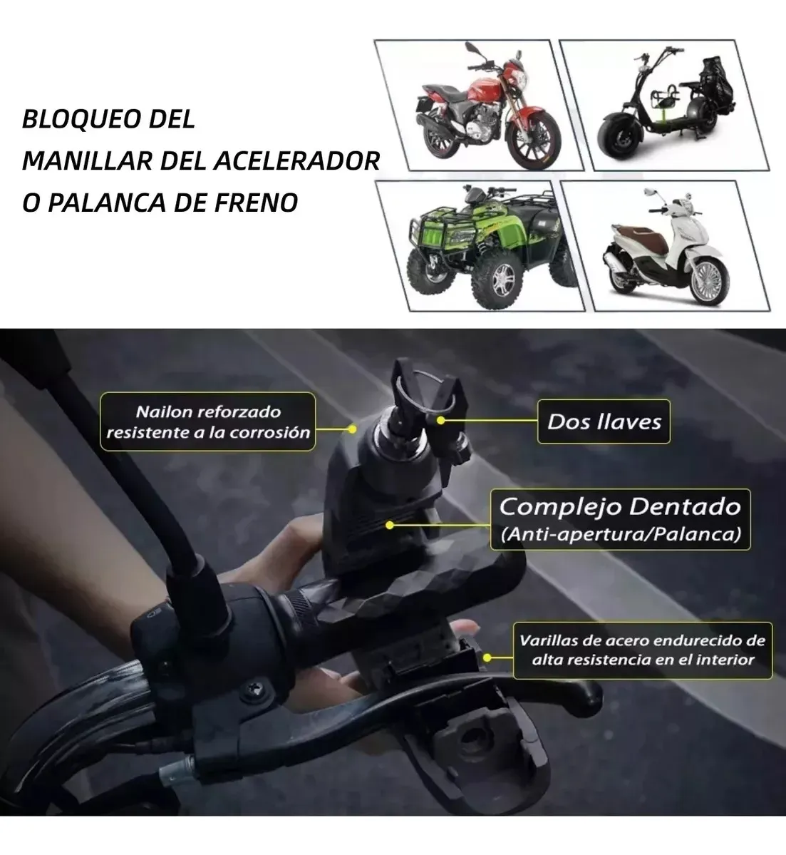 manillar con freno candado para moto con alarma La cerradura cuenta con un diseño complejo que evita que se manipule, proporcionando una seguridad óptima para tu bicicleta, motocicleta o vehículo eléctrico. Diseñado para propietarios de Scooter, ciclomotores y todoterreno, el bloqueo de motocicleta proporciona tranquilidad contra robos. Su uso de palanca de freno delantero mantiene tu moto centrada y evita que se empuje del soporte. Con su diseño impermeable y a prueba de óxido, este bloqueo de seguridad de palanca de freno puede soportar condiciones climáticas adversas, lo que te permite usarlo incluso en días lluviosos. El candado de motocicleta está hecho de materiales duraderos y diseñado para soportar diversas condiciones climáticas. Su tamaño compacto y fácil almacenamiento lo convierten en un accesorio esencial para cualquier entusiasta de la motocicleta. El material de aleación de alta resistencia del núcleo de bloqueo es duradero y difícil de abrir o destruir. La cadena evita eficazmente el uso de tijeras y otras herramientas para cortar y mejorar la capacidad antirrobo.