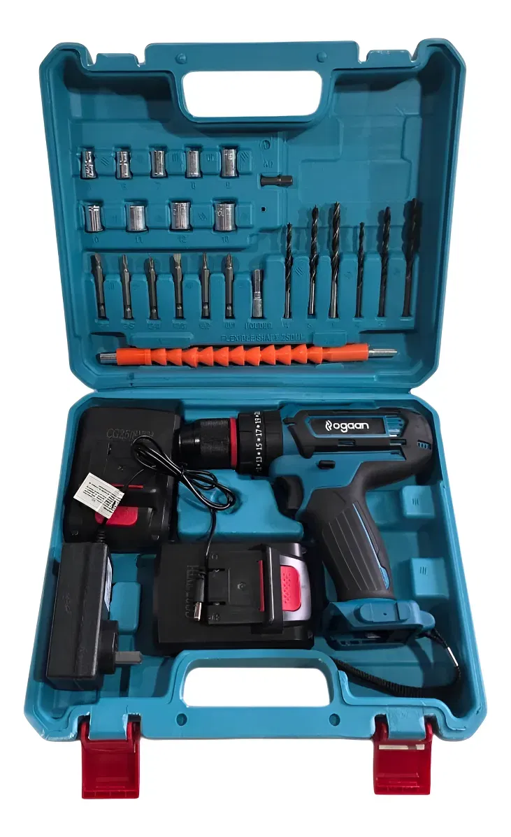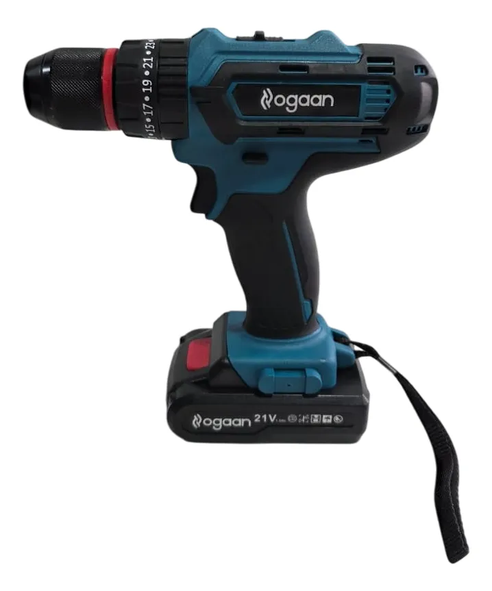 Taladro Atornillador y Percutor Ogaan 10 mm Detalle: - Mandril de Acero - 2 velocidades 0 a 350 y 1300rpm - Ajuste de par: 25 + Continua (taladro) - Luz led integrada para mejor visibilidad - Diseño liviano y compacto. Incluye: - 2 Baterías 21v 1500mAh - 1 Cargador Accesorios: - 6 Mechas - 6 Puntas para Atornillar - 9 Tubos hexagonales - 1 Punta adaptador a encastre 1/4" - 1 Porta punta - 1 Extensor de Punta Flexible para lugares difíciles Velocidad variable: el gatillo ajustable ofrece 2 velocidades (0-350 y 1300 rpm), y el botón lateral permite atornillar y desatornillar. La batería de iones de litio de 21v 1500mah, incluso una de repuesto, ofrece una potencia fuerte y efectiva. Portabrocas autoajustable de 10 mm y luz LED: gracias al portabrocas autoajustable de 10 mm es posible reemplazar las distintas puntas de forma rápida y sencilla sin el uso de llaves; la luz LED también le permite trabajar en entornos oscuros. Seguridad del producto: Este producto está sujeto a instrucciones y advertencias específicas de seguridad.