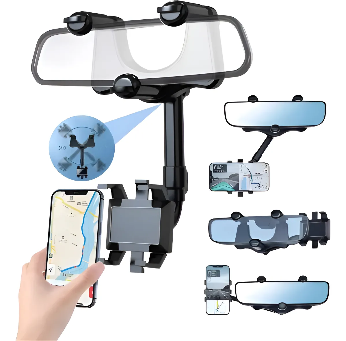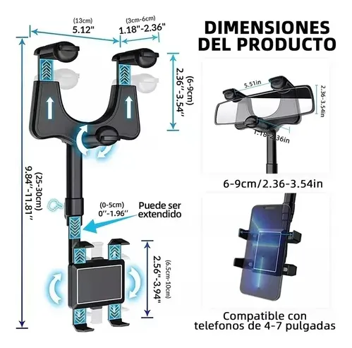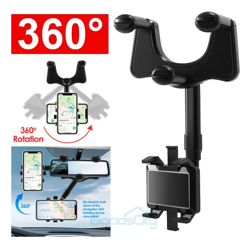 Soporte de teléfono para retrovisor de coche ajustable con rotación de 360° y seguro de bloqueo El soporte está diseñado para montar de manera segura y conveniente tu teléfono en el retrovisor del coche, proporcionando ajustes versátiles y un mecanismo de seguro para asegurar el dispositivo durante el viaje. Características: – Compatibilidad universal: Apto para la mayoría de los teléfonos móviles con dimensiones de 148-95-85mm. – Ajuste de rotación de 360°: Permite ajustar el ángulo de visión del teléfono para una visualización óptima. – Seguro de bloqueo: Mecanismo de bloqueo para mantener el teléfono seguro y estable durante el uso. – Instalación sencilla: Se monta fácilmente en el retrovisor del coche. – Material duradero: Construido con materiales resistentes para una larga durabilidad. – Compatibilidad de dimensiones: Adecuado para teléfonos con dimensiones específicas de 148mm de alto, 95mm de ancho y 85mm de profundidad. – Diseño compacto: Diseño que no obstruye la visión del conductor. Uso recomendado: Ideal para conductores que desean mantener su teléfono visible y accesible mientras conducen, garantizando seguridad y comodidad al mismo tiempo.