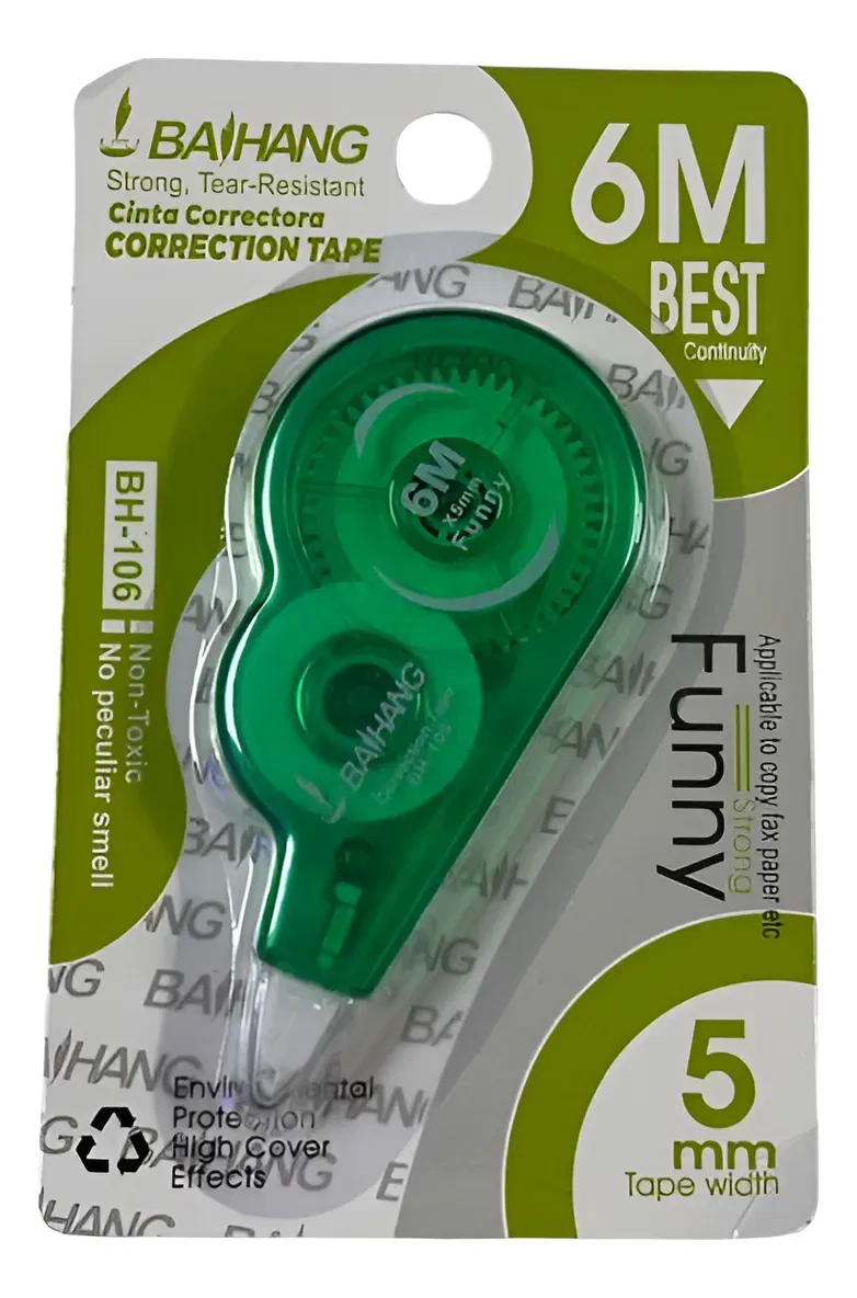 Corrector en Cinta 6m x 5mm Ideal para escuela, oficina o el hogar. Este corrector en cinta es práctico, limpio y de secado inmediato. Su diseño ergonómico y transparente permite ver el avance de la cinta fácilmente. Marca: Bahang Largo: 6 metros Ancho de cinta: 5 mm Medidas: 9x4.5 cm aprox No tóxico, sin olor Cobertura fuerte y uniforme Apto para papel normal, fax o fotocopias Empaque individual Protección ambiental Uso cómodo y preciso Listo para usar, sin tiempo de secado ¡Corrige de forma rápida y limpia tus errores con un solo trazo!