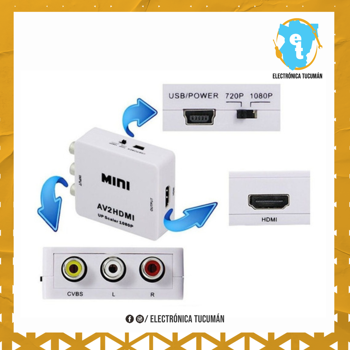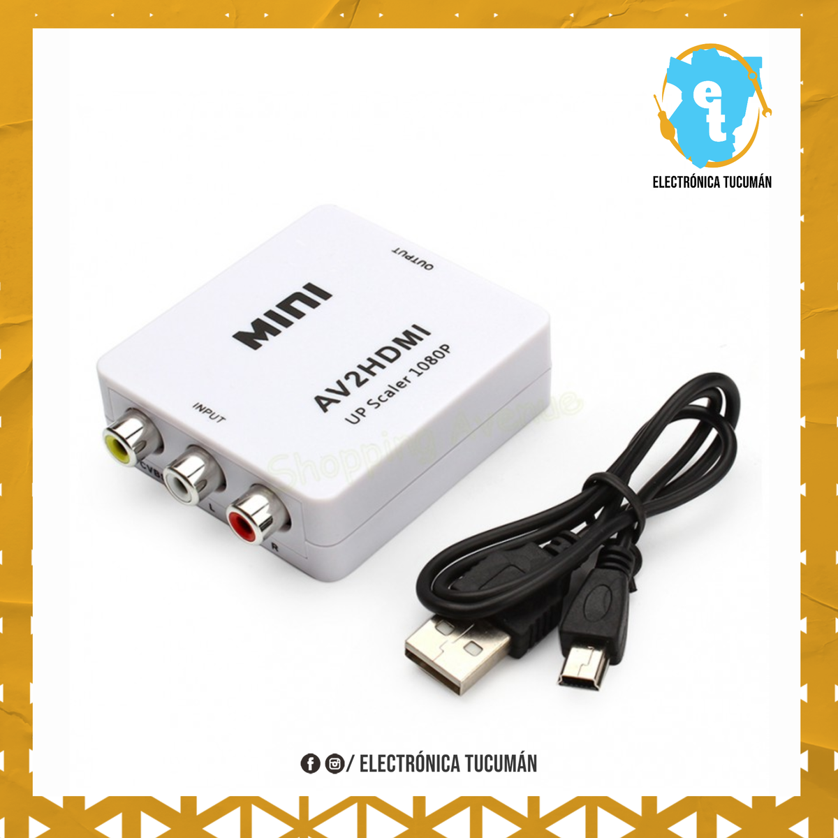 Descripción: Conversor Rca a HDMI Adaptador De Video Rca Av2 A Hdmi 720p 1080p Este convertidor universal permite alcanzar resoluciones de 720p y 1080p (60Hz). su instalación es muy fácil y rápida en pocos minutos podrás disfrutar de este fantástico producto (60Hz). No necesitas instalar drivers, es totalmente Plug & Play. Soporta formatos PAL, NTSC3.58, BTSC4.43, SECAN, PAL/M, PAL/N. Soporta resoluciones de salida HDMI de 720p o 1080p seleccionables Características: Medidas: 5,5 x 5,5 CM Longitud del cable: 74 cm Material: Plástico 1 x Conversor AV2HDMI 1 x Cable USB 1 x Manual de usuario
