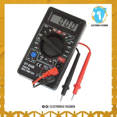 Tester Multimetro Digital 830D Compacto con buzzer HFE 10A MULTIMETRO CON BUZZER DT830D Características: Display LCD numérico de 3 ½ dígitos Rango manual Rangos voltaje DC: 200 mV, 2 V, 20 V, 200 V, 1000 V Rangos voltaje AC: 200 V, 750 V Rangos corriente DC: 2 mA, 20 mA, 200 mA, 10 A Rangos resistencia: 200 O, 2 kO, 20 kO, 200 kO, 2 MO Probador de diodos (ó junturas de semiconductores) Probador de continuidad con indicación audible Medidor de hFE de transistores bipolares. Rango: 0 a 1000 Inyector de señal cuadrada, 50 Hz, 3 Vpp aprox. Indicación de sobre rango Batería de 9 V (no incluida) Protección contra sobrecorriente mediante fusible de 250 mA (Rango de 10 A no protegido) Tamaño: 2.5 cm x 6.8 cm x 12.4 cm aprox. Incluye: 1 Multímetro 2 puntas de prueba 1 Manual