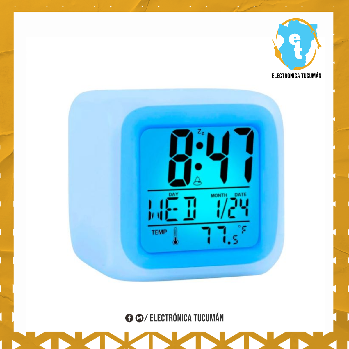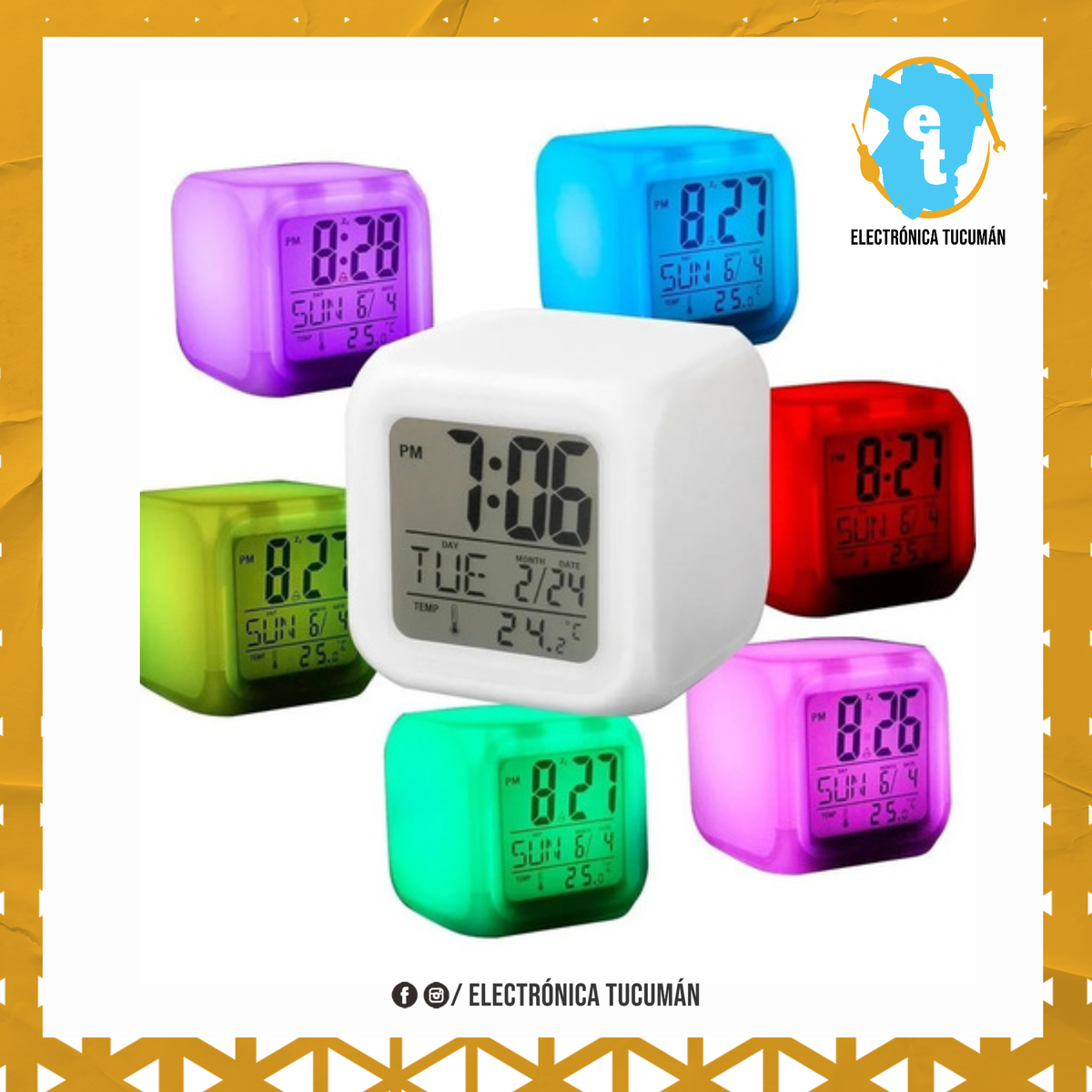 Reloj Digital Despertador Luminoso Luz De Noche Ambientación Ideal para no tener que prender la luz para ver la hora Decora tu habitación con este despertador de colores Para que disfrutes de esos 5 minutos extras de sueño – Diseño Moderno. – Va cambiando progresivamente de Color. – Emite 6 colores de Luz Led diferentes. – Informa la Hora, la Fecha y la Temperatura ambiente. – Ideal para el cuarto de los chicos – Super Funcional y Decorativo. – Alarma con diferentes sonidos. – Se puede usar como reloj de noche. * MEDIDAS: 7,5 cm. x 7,5 cm. x 7,5 cm. * ALIMENTACIÓN: 3 pilas AAA (no incluidas). * MATERIAL: Plástico. * COLORES LUZ LED: Rojo, Azul, Violeta, Blanco, Amarillo, Verde