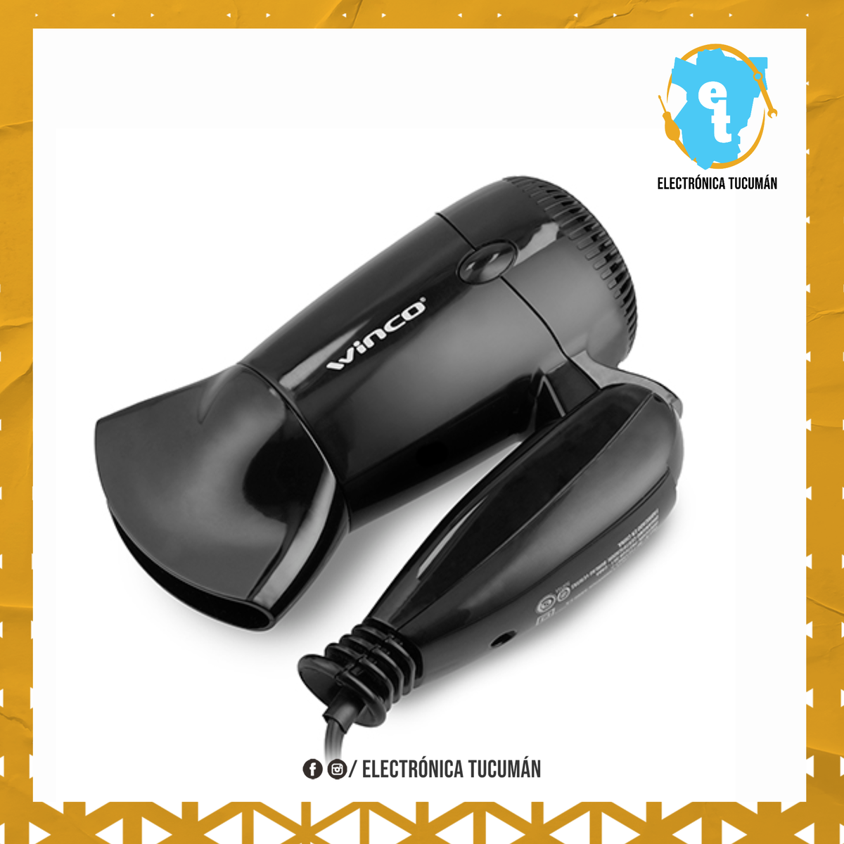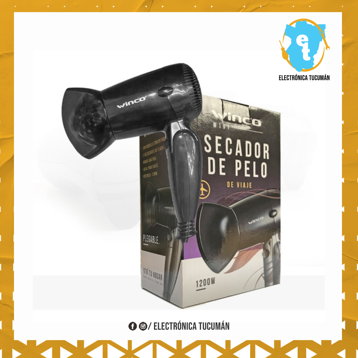 Secador de pelo ideal viaje - Marca : winco - Modelo : w191 - Potencia : 1200w - Boquilla concentradora - 2 niveles de temperatura - Compacto y practico - Mango Plegable para un fácil transporte - Gran facilidad de moldeado - Bajo nivel de ruido - Medida plegado aprox : 20 cm x 10 cm - Medida no plegado aprox : 20 cm x 20 cm