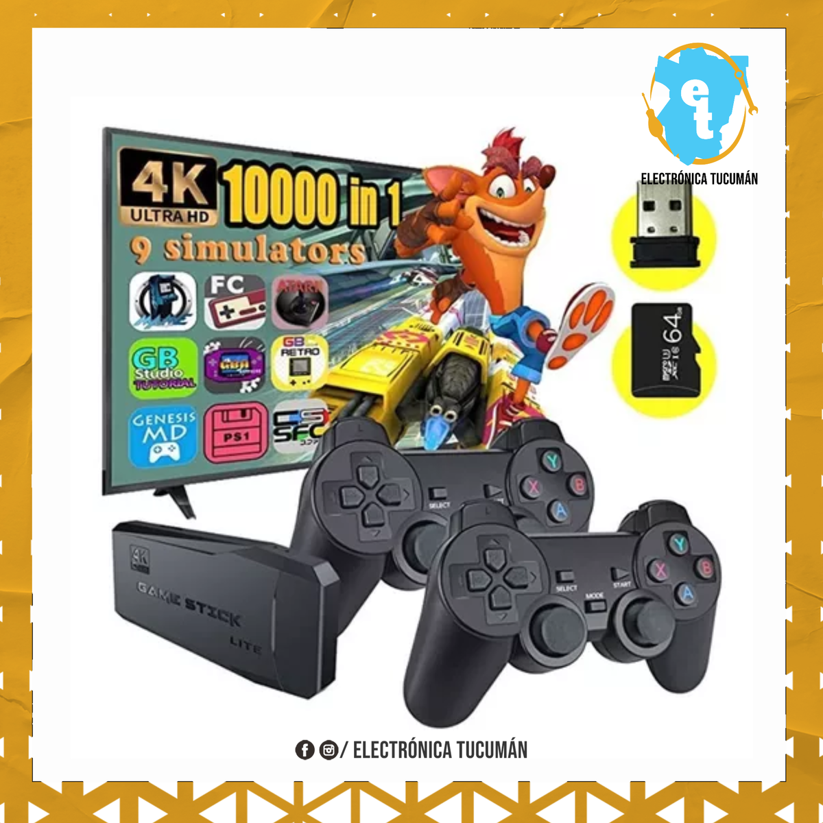 Consola Retro con 10000 Juegos vintage 4K 1080P. Conecta el stick por HDMI y USB A La TV y juga con los dos mandos inalámbricos incluidos a los mejores juegos de la historia. Emula juegos de MAME / FC / GB / GBA / GBC / MD / SFC / PS1 / ATARI2500 / ATARI7800. Incluye: Super Mario Bross 1 / 2 / 3 Metal Slug Super Sidekick Tortugas Ninja Zelda Pokemon Sonic Arkanoid Tetris Pac-Man Entre otros mas de 10000 juegos originales vintage retro y clasicos.