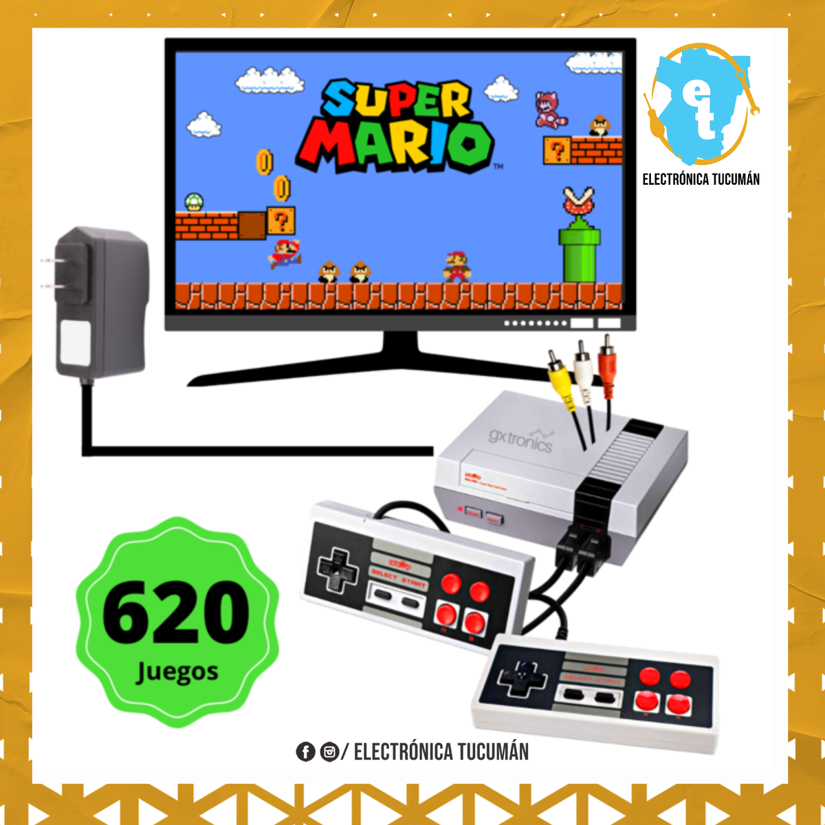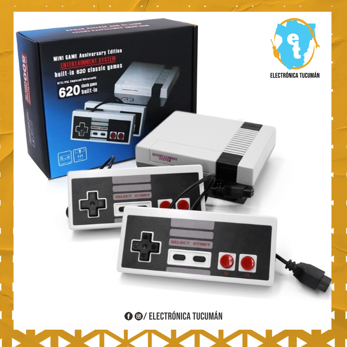 •Consola de juegos con 620 juegos clásicos integrados en 8 bit •Tiene un diseño clásico a la NES, con controles universales de 9 Pin, •110V-220V, 50-60 Hz. •Incluye: Consola, Controles, Cable AV, Cable de poder, manual de uso Esta máquina de juego no solo te permite experimentar el nuevo juego con los últimos equipos, sino que también te recuerda los dulces recuerdos de los viejos juegos. 100 PCT nuevos y de alta calidad. 620 juegos clásicos incorporados. Toda la acción tiene lugar en una pantalla, desde una perspectiva en tercera persona alejada. Fácil de controlar Devolviéndote muchos recuerdos de juego cariñosos. Con 2 controladores de juegos, plug and play, adecuado para familias, amigos, parejas, etc. No necesita otras tarjetas de juego y descargar, con sistema de entretenimiento. ESPECIFICACIONES Tipo de artículo: consola de juegos clásica Game Console: para 8 bits, no es compatible con tarjetas de juegos Juegos: juegos de video integrados de televisión infantil 620 Sistema de señal de TV: NTSC / PAL Estado del televisor: A.V. Fuente de alimentación: AC 110-220V Salida DC 6V-150mA Controlador: controlador con cable doble Material: ABS Compatible con: NES Número de Sesión de Juegos: 620 Idioma: Inglés