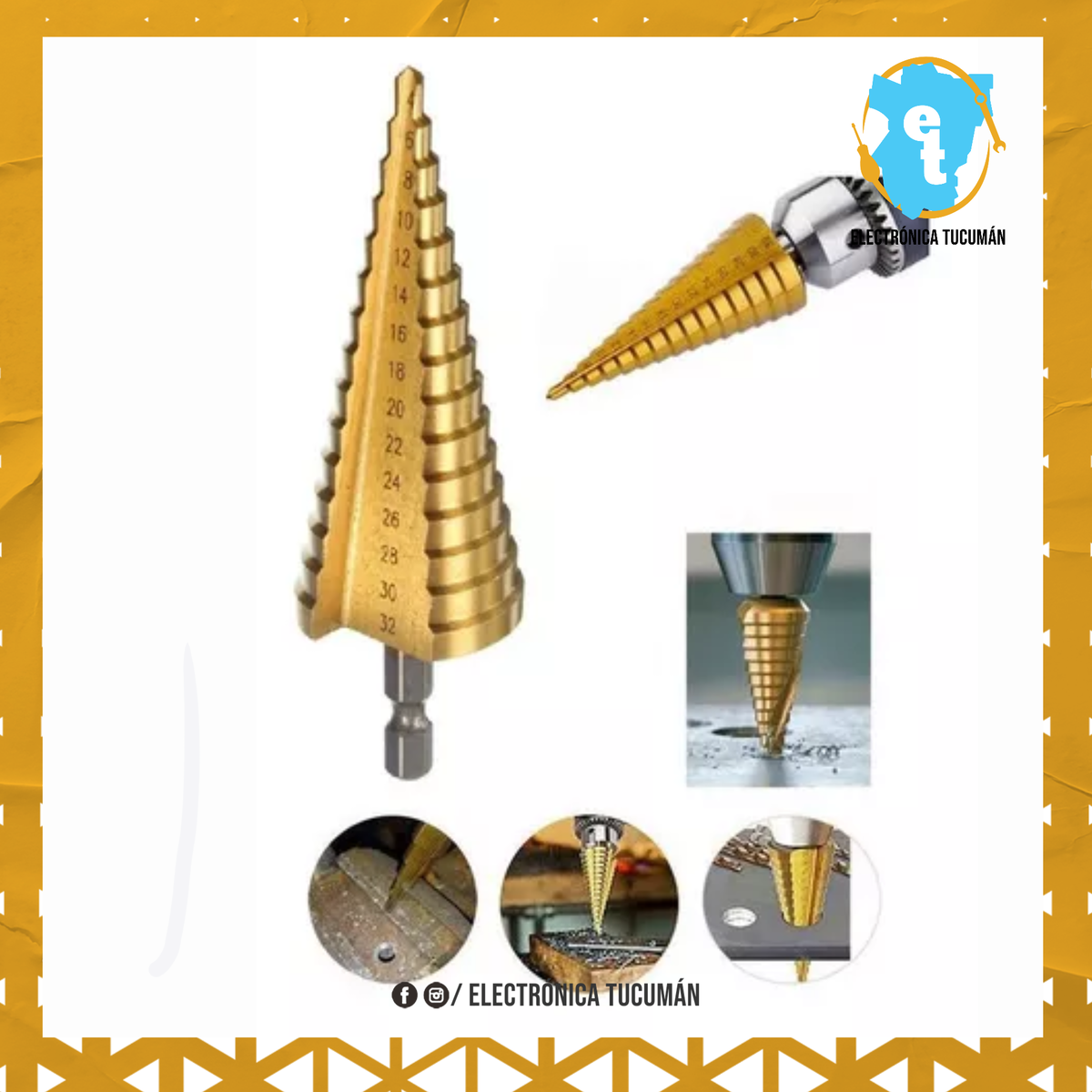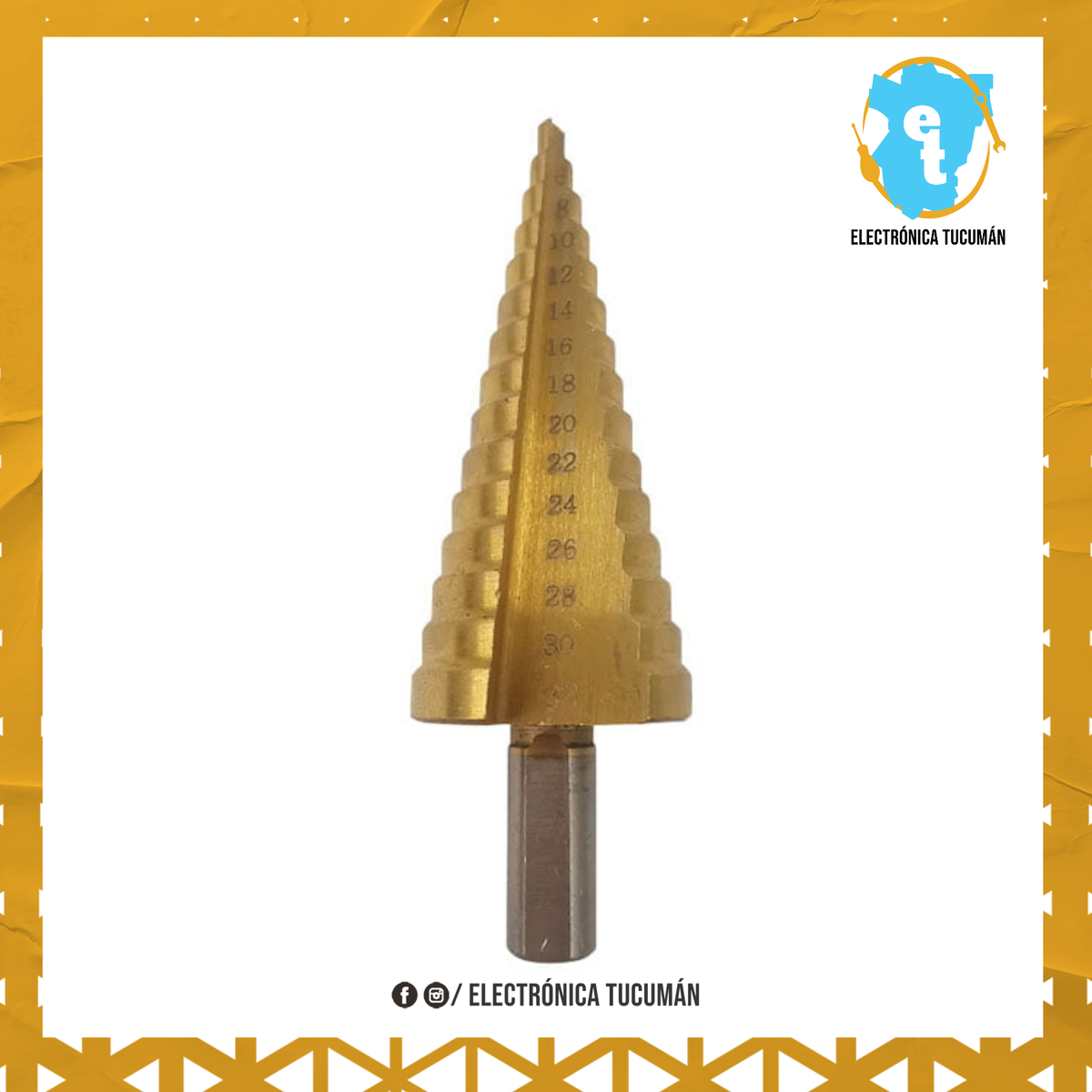 MECHA ESCALONADA CON BAÑO DE TITANIO 4 A 32 MM. CARACTERÍSTICAS GENERALES – Medidas: 4, 6, 8, 10, 12, 14, 16, 18 20, 22, 24 ,26, 28, 30, 32 mm. – Para utilizar en : chapa, metales, plástico . ( Hasta 1mm ) INCLUYE Una mecha escalonada con baño de titanio de 4 a 32 mm.
