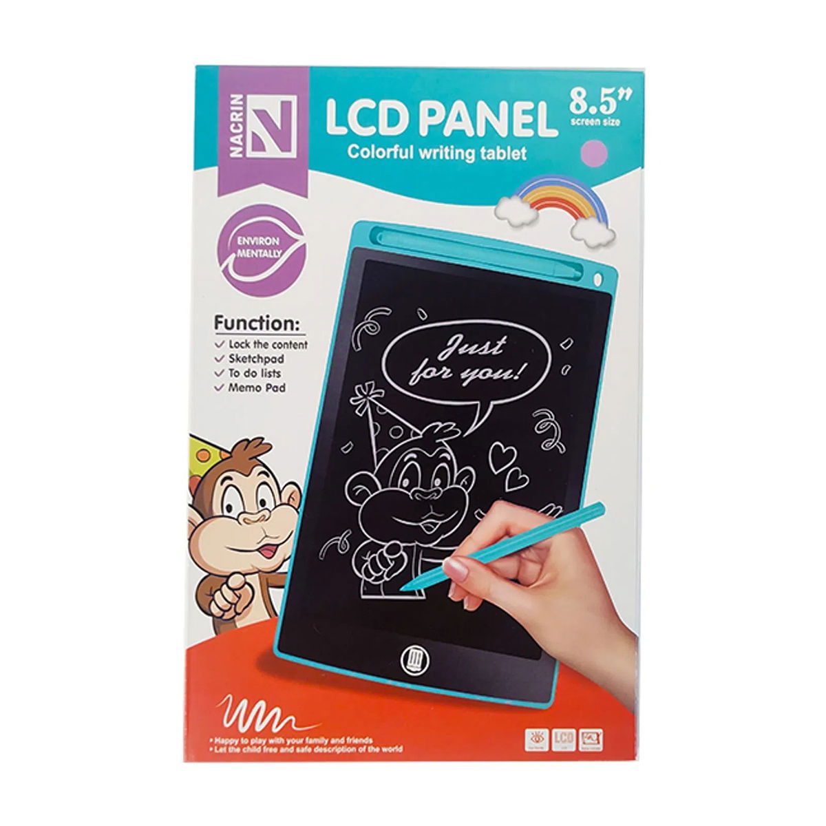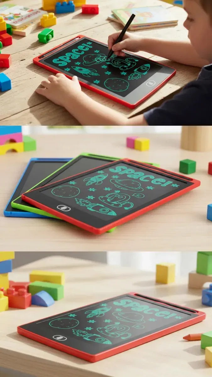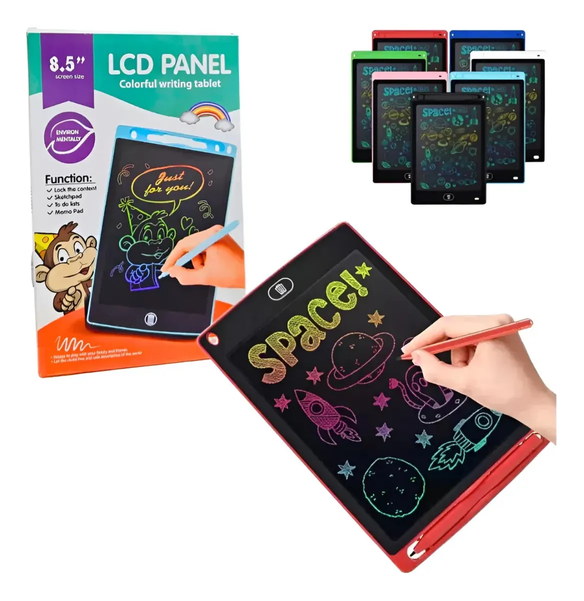 - PIZARRA MULTICOLOR 8,5" - Escritura sensible a presión - Botón de borrado - Perilla protección del contenido - Producto resistente - Eco Amigable - No mas papel! - Funciona con pila (Incluida) - Viene con su lápiz Colores: Negro, Rojo, Celeste, Verde y