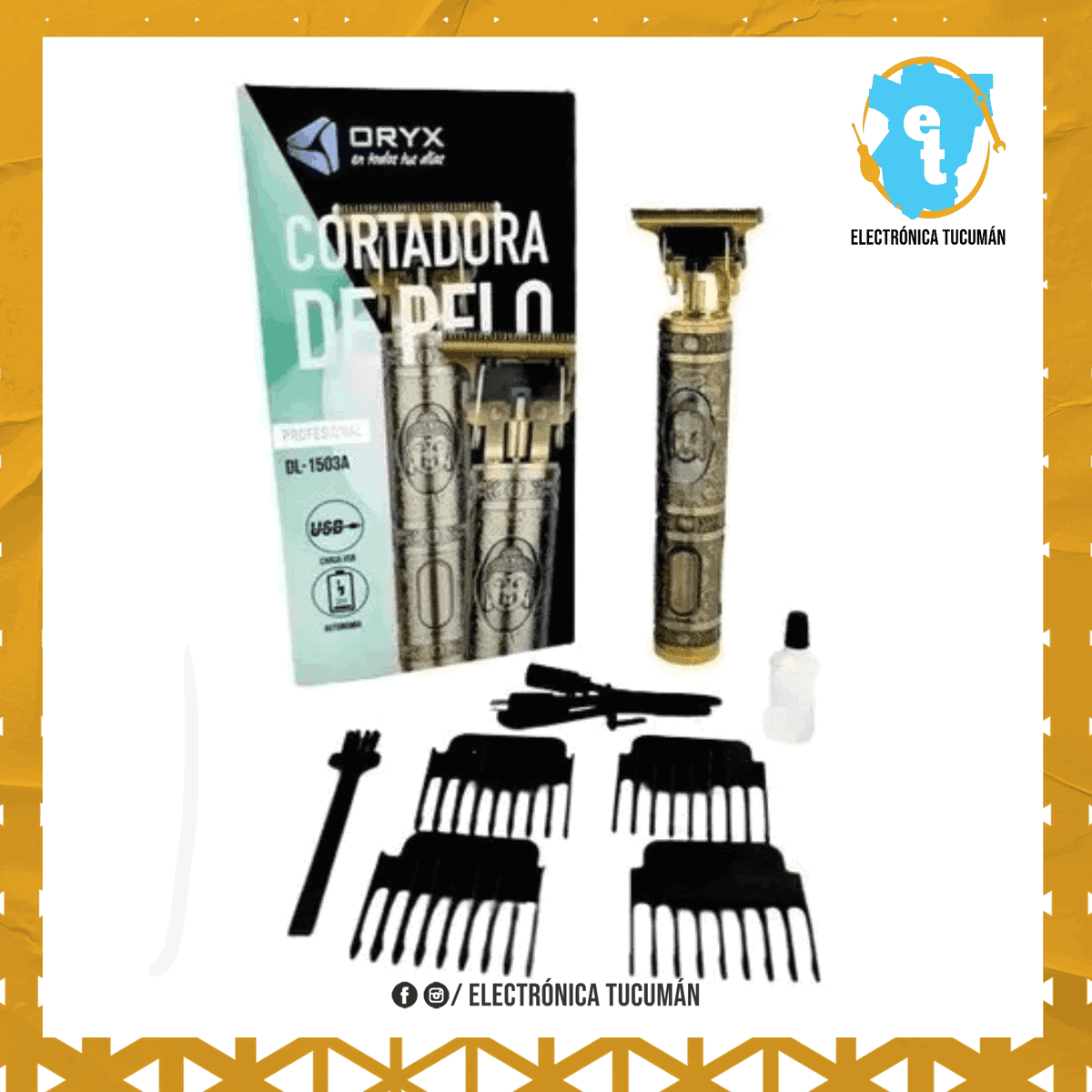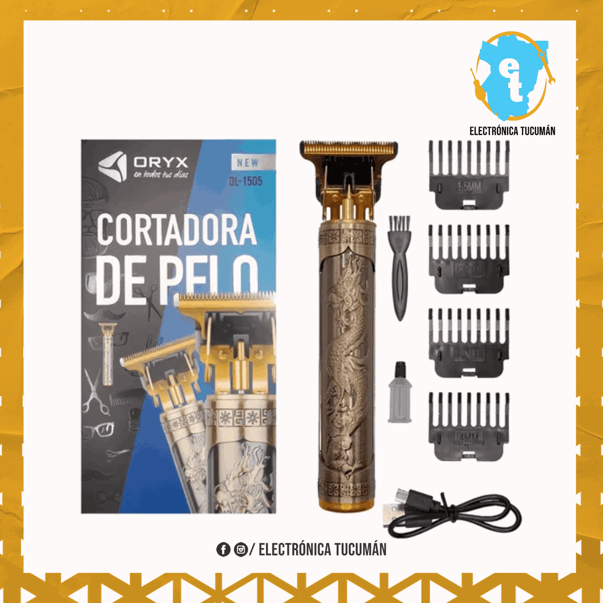 ¡Pero eso no es todo! Con los 4 peines intercambiables incluidos (1.5mm, 2mm, 3mm, 4mm), puedes personalizar tu corte según tu estilo y preferencia. Además, viene con accesorios indispensables como un cargador de batería con indicador lumínico, un cepillo de limpieza y aceite lubricante de cuchillas, asegurando un mantenimiento óptimo y durabilidad para tu máquina.