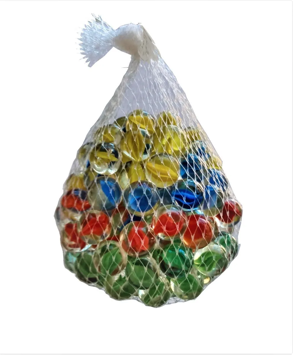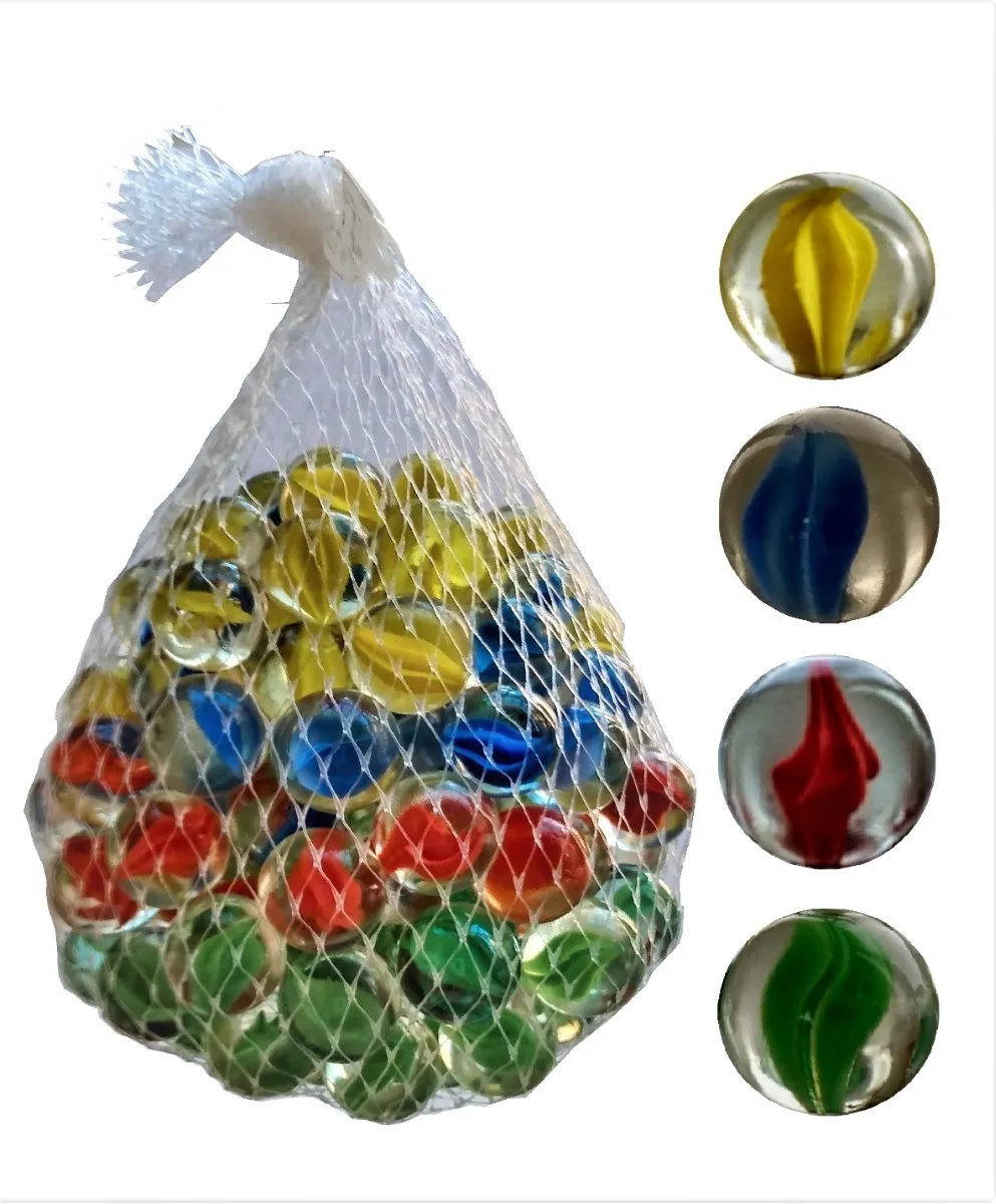 Paquete con 100 Canicas de Vidrio Tipo "FLAMA" Contenido CANICAS DE VIDRIO 100 Canicas de vidrio medida aproximada 14 a 17 milímetros de diámetro. 4 brillantes colores 25 canicas tono rojo 25 canicas tono verde 25 canicas tono azul 25 canicas tono amarillo Tal como se muestran en la imagen.