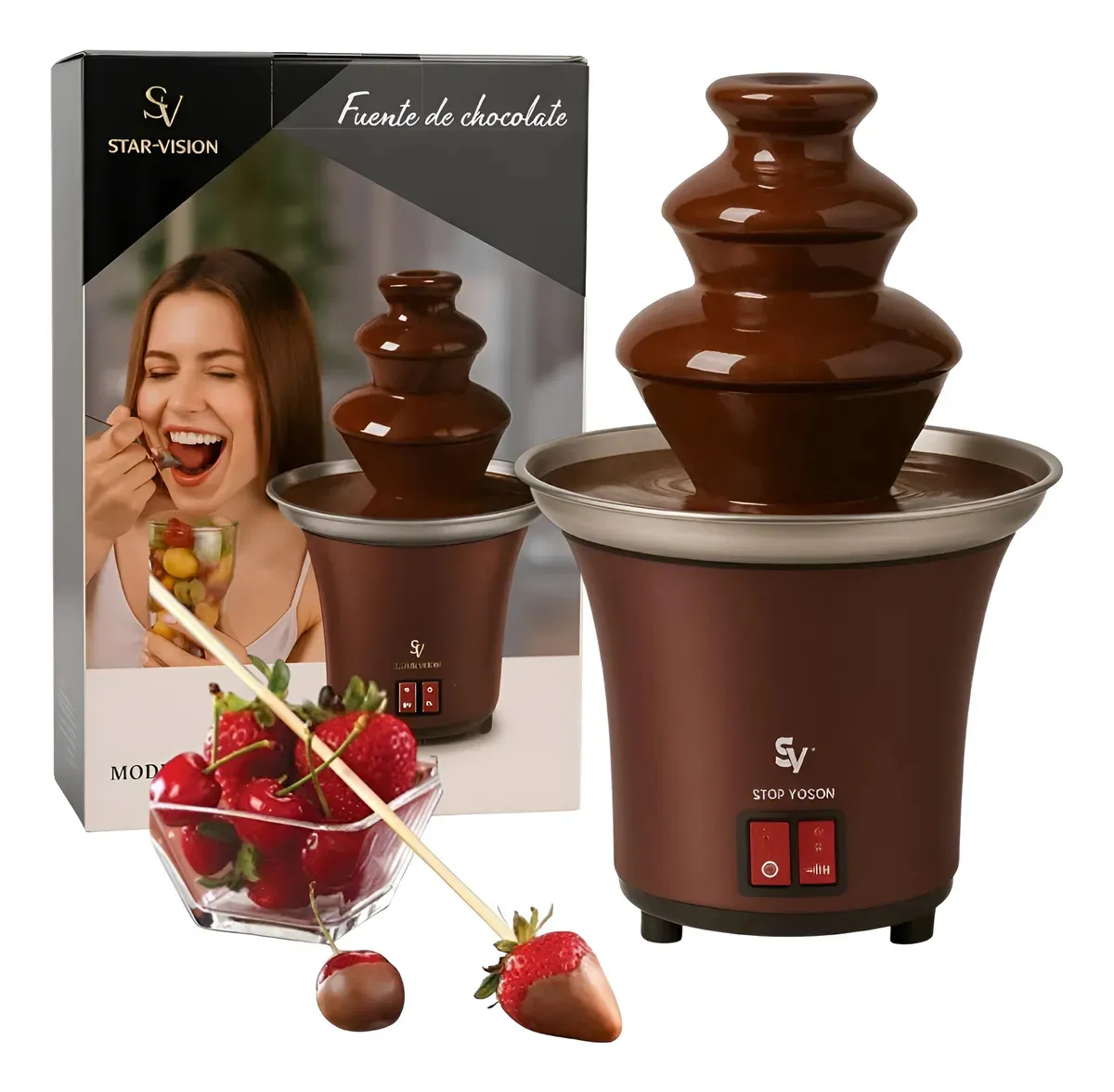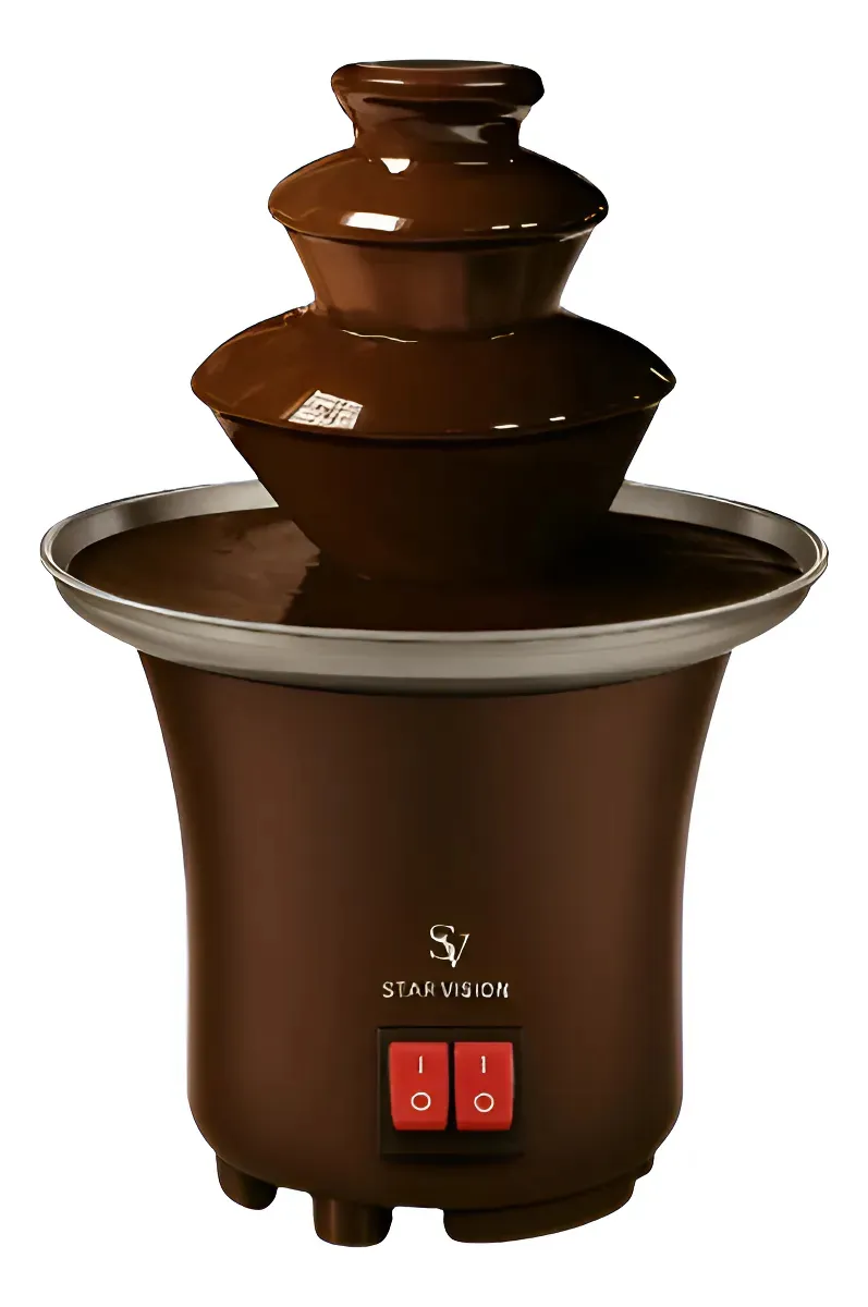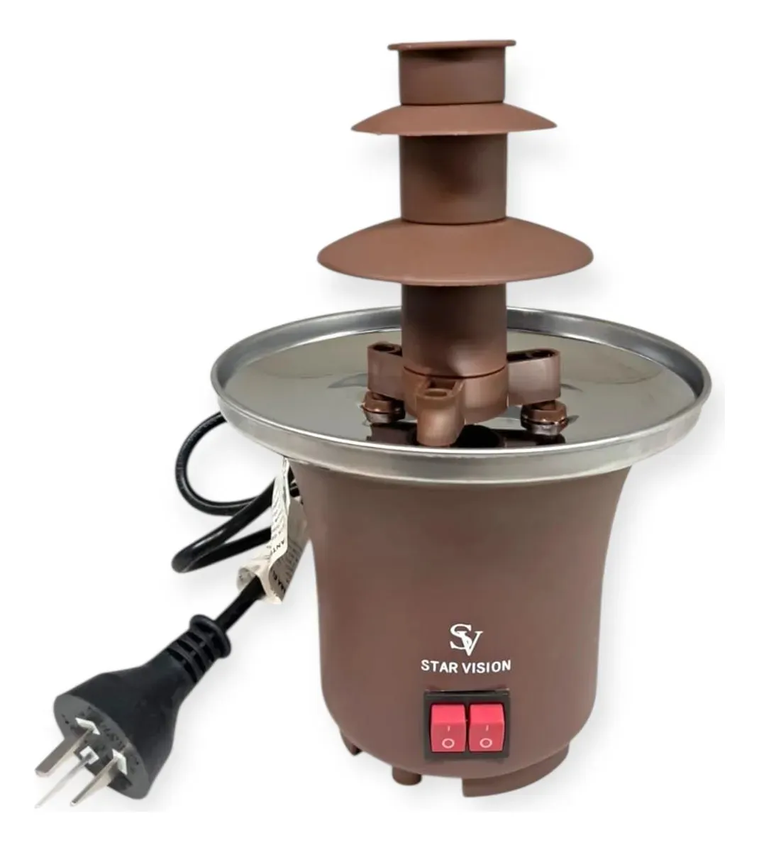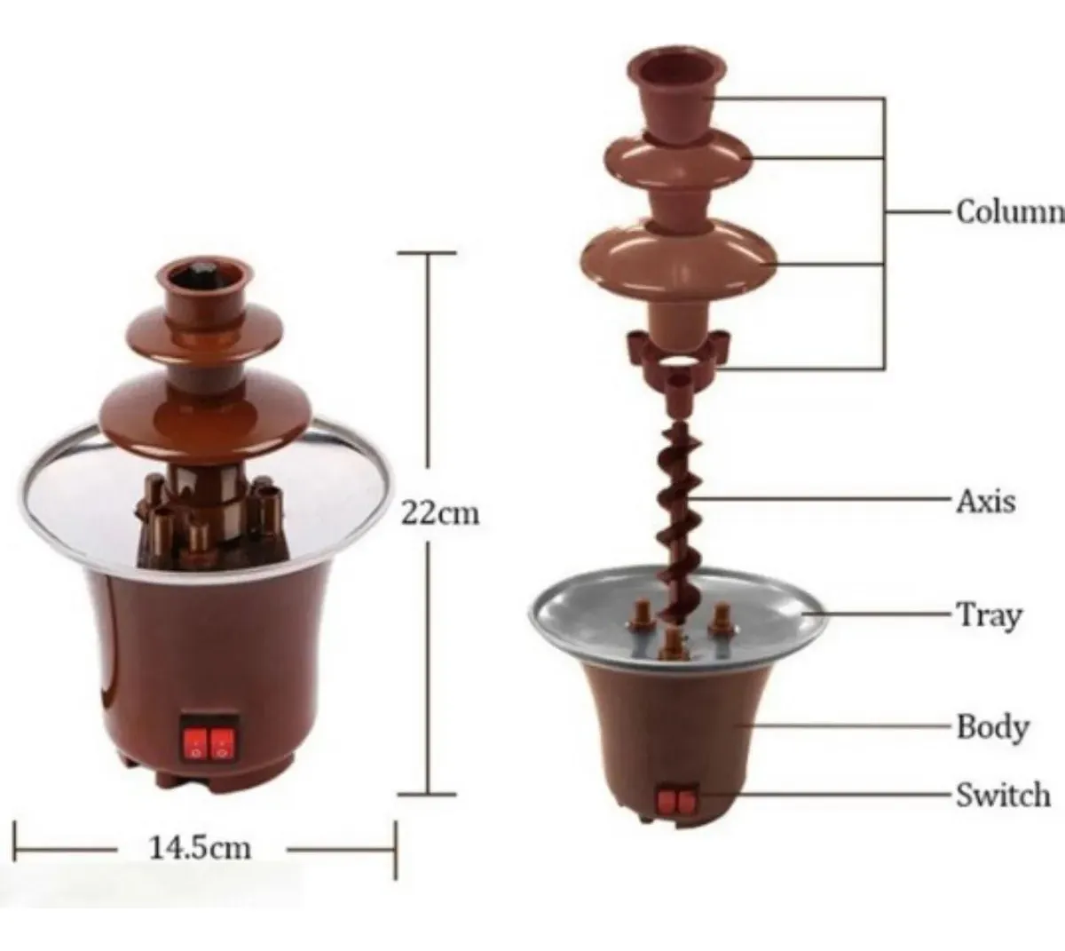 - Fuente de chocolate de color marrón, con diseño de cascada. - Es un producto super práctico para uso domestico, por su capacidad y tamaño. Al poder desarmarse permite que se lo pueda guardar en espacios reducidos - La fuente tiene 3 cascadas. - Cuenta con 3 patitas de soporte y antideslizantes en cada una de ellas para un mejor y práctico funcionamiento. - Cuenta con dos funciones: la de girar o funcionar y derretir. - De fácil uso, deje calentar la fuente, luego prepare la mezcla de la fondue en un recipiente y viértala en el bowl, recuerde no sobrecargarlo. Coloque la perilla en posición I para mantener la mezcla líquida y caliente. Cuando considere cambie la perilla a la posición II, la mezcla comenzara a salir por las cascadas. *Potencia: 45 watts *Capacidad: 200 ml *Fácil de usar *Fácil de limpiar *Base con calentador para que el chocolate fluya *Sistema de tornillo sin fin *Medidas: Diámetro 14cm / Altura 22cm.