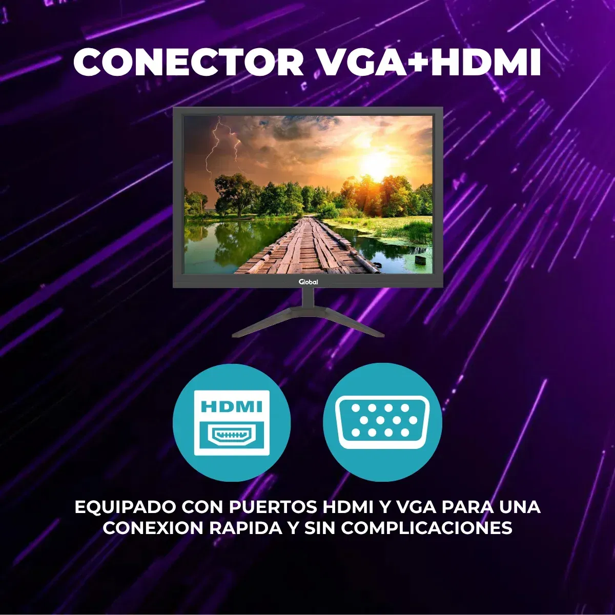 El Monitor Global Office 21.5" LED Full HD ofrece una excelente calidad de imagen para uso diario en oficina, hogar o estudio. Su pantalla de 21.5 pulgadas con resolución 1920 x 1080 brinda colores nítidos y gran nivel de detalle. Cuenta con relación de aspecto 16:9, tiempo de respuesta de 5 ms y frecuencia de actualización de 60 Hz, ideales para tareas de oficina, navegación web, clases virtuales y contenido multimedia. Su diseño delgado y moderno se adapta fácilmente a cualquier espacio de trabajo. Incluye conexión HDMI y VGA, permitiendo compatibilidad con PCs, notebooks y otros dispositivos. Características principales: Pantalla LED de 21.5" Resolución Full HD (1920 x 1080) Relación de aspecto 16:9 Brillo: 250 cd/m² Contraste: 1000:1 Ángulo de visión: 178° (H) / 178° (V) Tiempo de respuesta: 5 ms Entradas: HDMI y VGA Energía eficiente – Clase A Diseño delgado y elegante Ideal para quienes buscan un monitor confiable, funcional y con gran rendimiento visual.